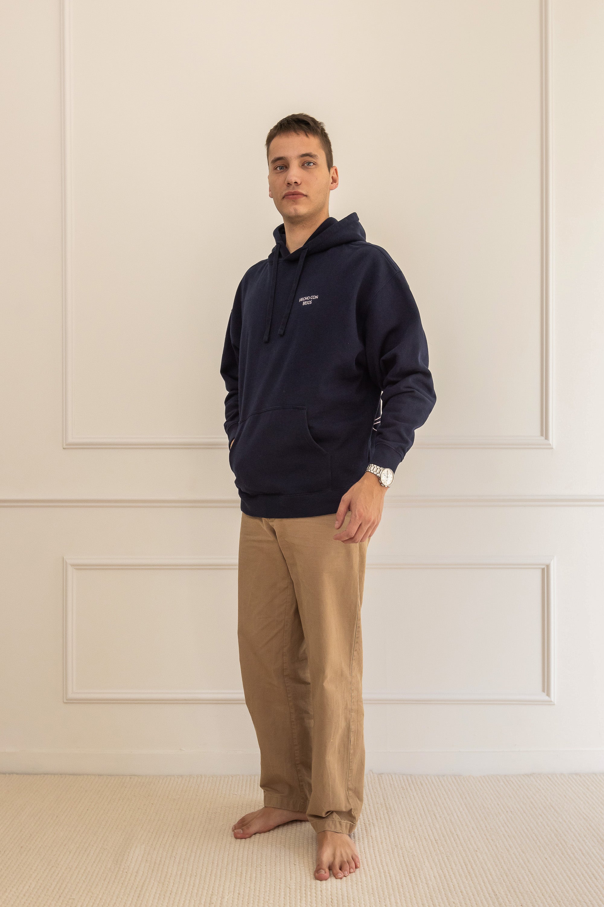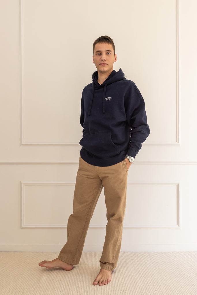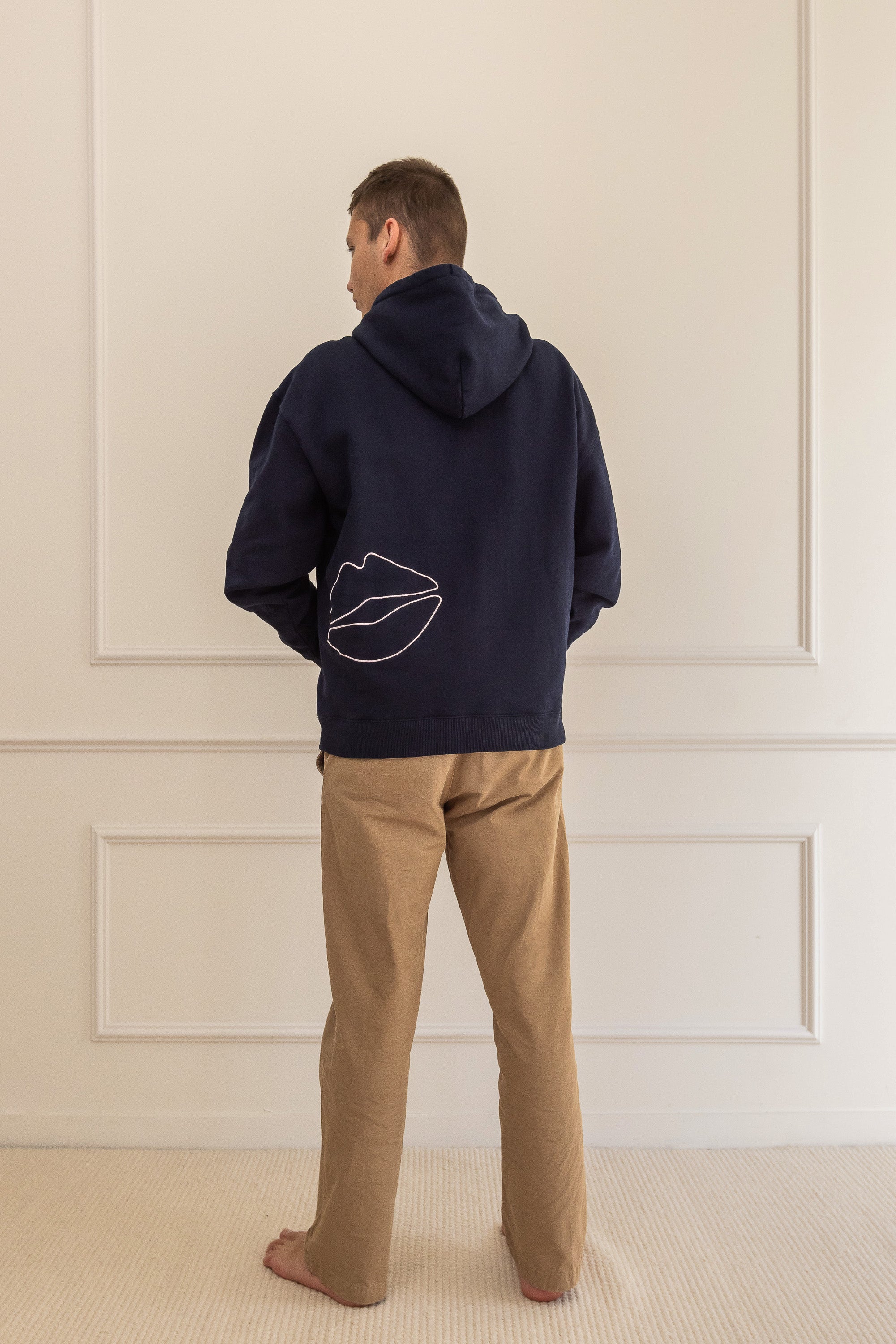 La Sudadera HECHO CON BESOS Azul Marino combina confort y estilo con su tono azul marino elegante y su diseño atemporal y moderno.