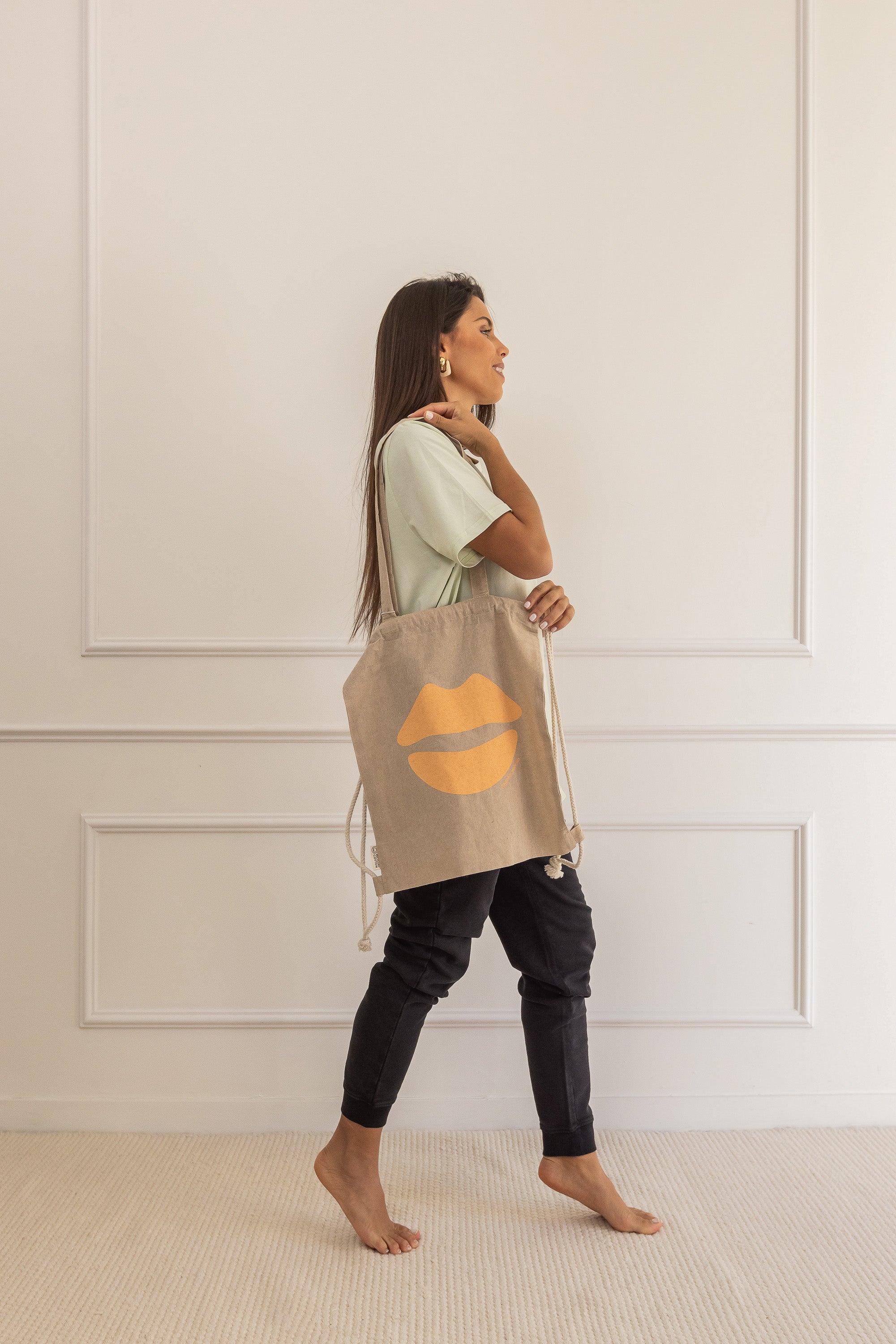 Lleva estilo y alegría con nuestra tote bag color beige natural, confeccionada en algodón reciclado. Su estampado de un beso en naranja aporta un toque único y vibrante, combinando diseño eco-friendly, resistencia y funcionalidad, ideal para uso diario, compras o trabajo.
