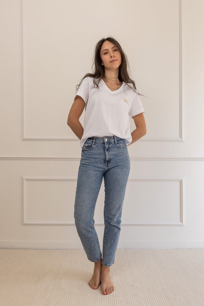Camiseta blanca mujer de cuello en pico HECHO CON BESOS