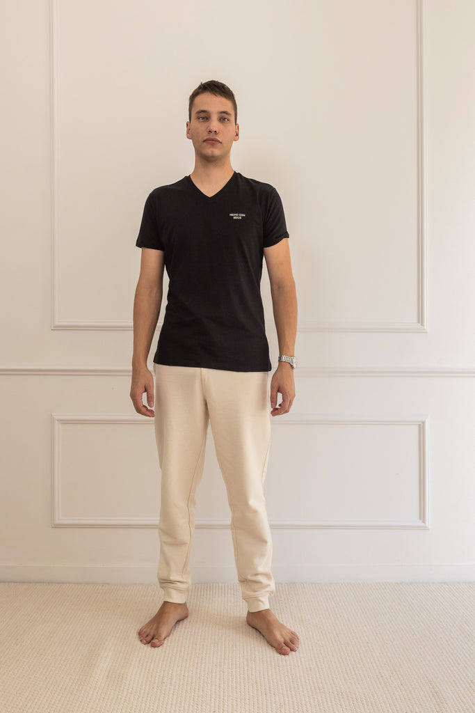 Camiseta negra de cuello en pico HECHO CON BESOS, confeccionada en 100% algodón orgánico.