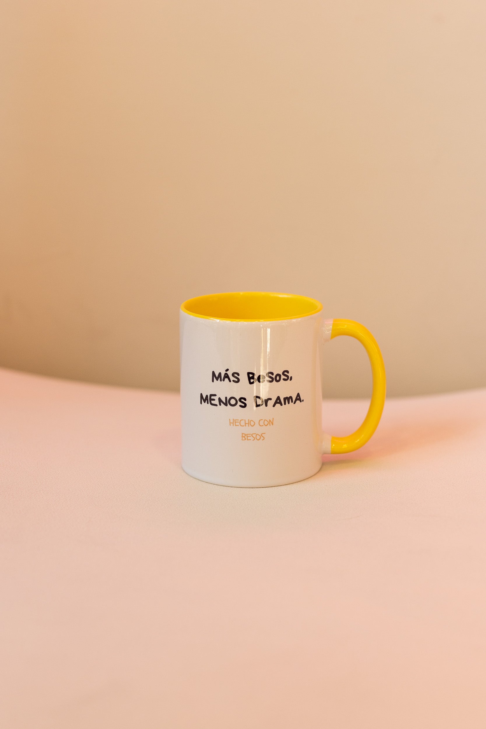 Disfruta tus bebidas favoritas con esta taza amarilla original, decorada con un beso y la frase “Más besos, menos drama…”.